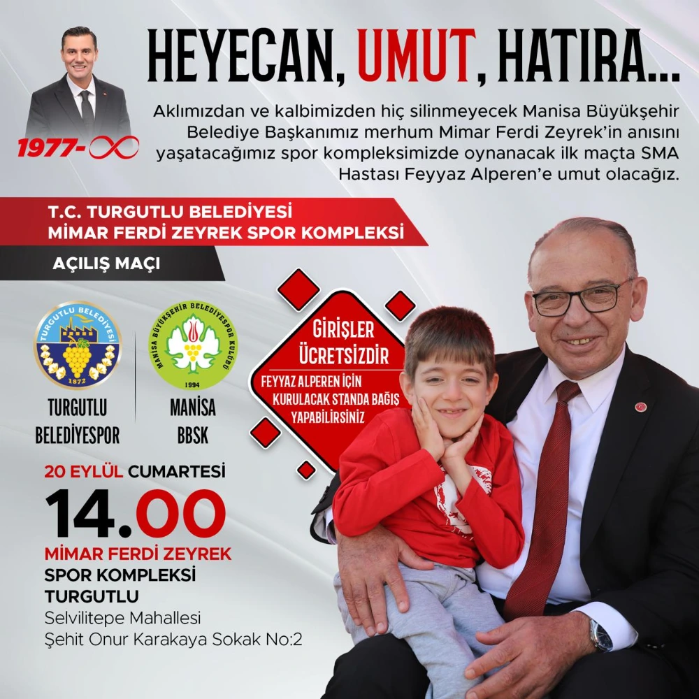 (MHA) Turgutlu Belediyesi tarafından yapımı tamamlanan ‘Turgutlu Belediyesi Mimar Ferdi Zeyrek Spor Kompleksi’nin açılış maçı 20 Eylül Cumartesi günü saat 14.00’te oynanacak. Turgutlu Belediyesi Kadın Voleybol Takımı, açılış maçında Manisa Büyükşehir Belediyespor Kulübü’nü konuk edecek. Turgutlu Belediyesinin kendi imkan ve kaynaklarıyla kente kazandırılan, haziran ayında talihsiz bir kaza sonucu hayatını kaybeden Manisa Büyükşehir Belediye Başkanı Merhum Ferdi Zeyrek’in isminin yaşatılacağı ‘Turgutlu Belediyesi Mimar Ferdi Zeyrek Spor Kompleksi’nde ilk maç heyecanı yaşanacak. Cumhuriyet Halk Partisi Genel Başkanı Özgür Özel ve Manisa Büyükşehir Belediye Başkanı Besim Dutlulu’nun katılımıyla 19 Eylül Cuma günü açılışı yapılacak spor kompleksinde ilk maç 20 Eylül Cumartesi günü saat 14.00’te oynanacak. Turgutlu Belediyesi Kadın Voleybol Takımı’nın ev sahipliği yapacağı açılış maçında, TVF Kadınlar 1.Ligi’nde yer alan Manisa Büyükşehir Belediyespor Kulübü konuk olacak. Açılış maçında Feyyaz Alperen’e umut olunacak Turgutlu Belediyesi Kadın Voleybol Takımı ile Manisa Büyükşehir Belediyespor Kulübü arasındaki oynanacak açılış maçında aynı zamanda SMA Tip2 kas hastalığıyla mücadele eden Feyyaz Alperen’e de umut olunacak. Spor kompleksinde kurulacak standa, maçı izlemeye gelecek sporseverler Feyyaz Alperen’in sağlığına kavuşması adına bağış yapabilecek. “Hemşehrilerimizi açılış maçımıza davet ediyoruz” “Spor kompleksimizde Manisa sevdalısı, çocuklar ve gençler için büyük hayalleri olan Büyükşehir Belediye Başkanımız Merhum Ferdi Zeyrek’in ismini ve hatırasını yaşatacağız” diyen Turgutlu Belediye Başkanı Çetin Akın, “Turgutlu’muza kazandırmaktan gurur duyduğumuz, ‘Turgutlu Belediyesi Mimar Ferdi Zeyrek Spor Kompleksi’nin açılış maçını 20 Eylül Cumartesi günü gerçekleştireceğiz. Açılış maçında aynı zamanda Turgutlu’muzun evladı Feyyaz Alperen’in sağlığına kavuşması için yürütülen kampanyaya da hep birlikte destek olacağız. Tüm hemşehrilerimizi Belediyemiz Kadın Voleybol Takımı ve Manisa Büyükşehir Belediyespor Kulübü arasında dostluk ruhuyla oynanacak açılış maçımıza davet ediyoruz” dedi.