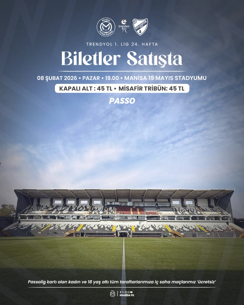 Karşılaşmanın bilet fiyatları ise Kapalı Alt Tribün için 45 TL, misafir tribünü için yine 45 TL olarak açıklandı. Kulüp yönetimi, Boluspor maçı öncesinde tüm Manisalılara “Takımına sahip çık” çağrısı yaparak, taraftarları Manisa 19 Mayıs Stadyumu’nda buluşmaya davet etti.