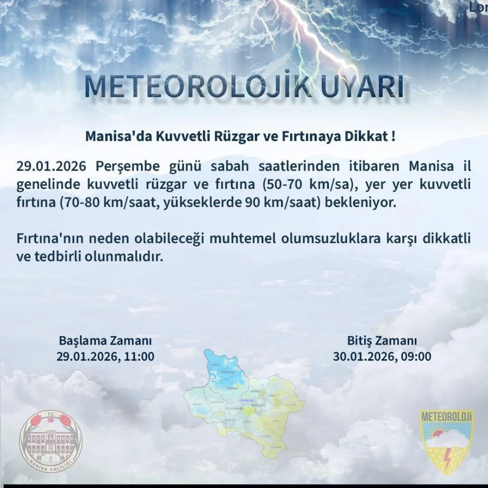 Meteoroloji, 29 Ocak Perşembe sabahından itibaren Manisa genelinde 90 km/saat hıza ulaşabilecek kuvvetli rüzgar ve fırtınaya karşı uyardı.