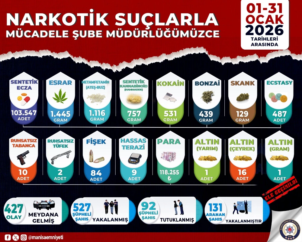 01–31 Ocak 2026 tarihleri arasında yürütülen çalışmalar kapsamında toplam 427 olay meydana geldi. Bu olaylarla ilgili 527 şüpheli şahıs yakalanırken, adli makamlara sevk edilen şüphelilerden 92’si tutuklanarak cezaevine gönderildi. Narkotik birimlerince haklarında yakalama kararı bulunan 131 aranan şahıs da operasyonlar sırasında yakalanarak adli mercilere teslim edildi.