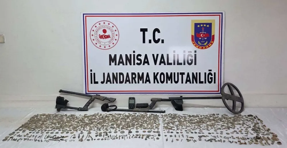 ait olduğu değerlendirilen 2 bin 580 adet sikke, 235 adet tarihi obje ve 1 adet dedektör ele geçirildi.